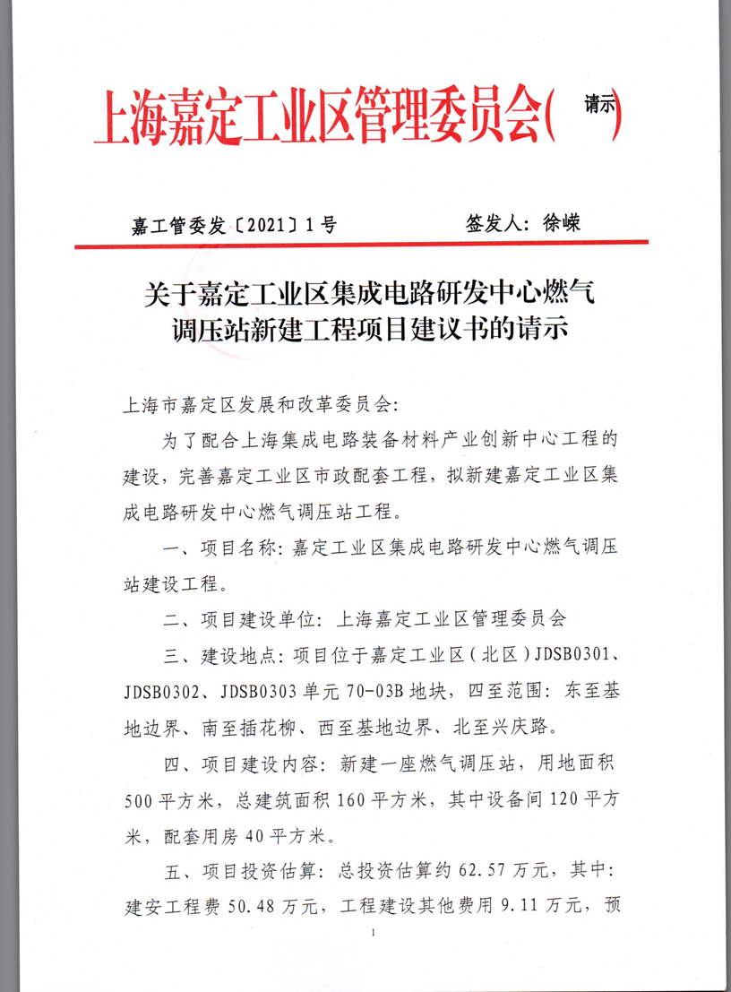 嘉工管委发(2021)1号上海嘉定工业区管理委员会关于嘉定工业区集成电路研发中心燃气调压站新建工程项目建议书的请示