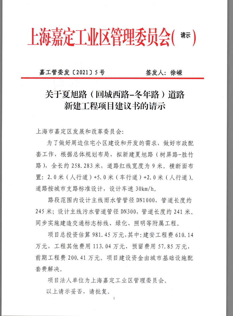 嘉工管委发(2021)5号上海嘉定工业区管理委员会关于夏旭路(回城西路-冬年路)道路新建工程项目建议书的请示