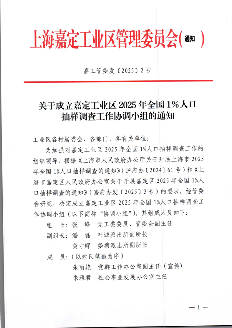 嘉工管委发〔2025〕2号上海嘉定工业区管理委员会关于成立嘉定工业区2025年全国1%人口抽样调查工作协调小组的通知