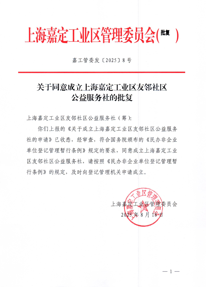 嘉工管委发〔2025〕8号上海嘉定工业区管理委员会关于同意成立上海嘉定工业区友邻社区公益服务社的批复
