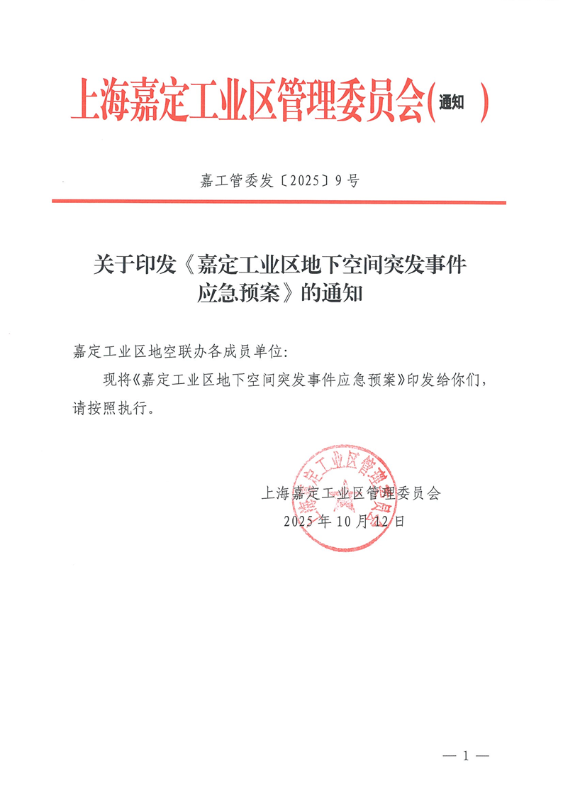 嘉工管委发〔2025〕9号上海嘉定工业区管理委员会关于印发《嘉定工业区地下空间突发事件应急预案》的通知